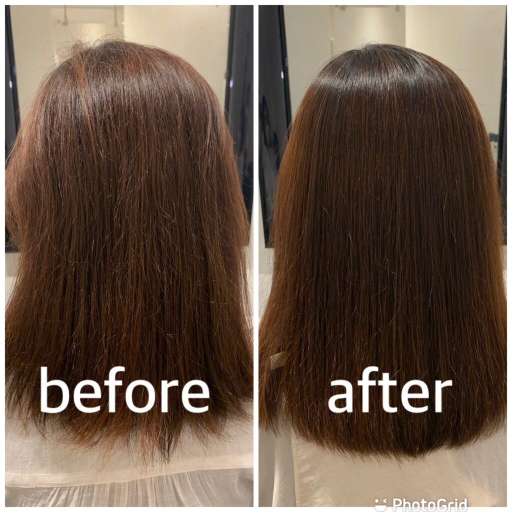 そこで今回は髪全体を保湿しながら、天然の栄養分と薬剤を調合したお薬でクセを伸ばしながら、髪質改善させて頂きました。